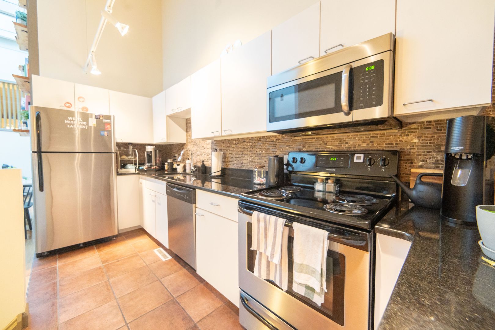 Experience modern loft-style living in this spacious 3-bedroom, 2-bathroom apartment featuring polished concrete floors, exposed brick, and oversized windows that fill the space with natural light. The newly renovated kitchen boasts stainless steel appliances, granite countertops, solid wood cabinets, and a sleek glass mosaic backsplash. The first floor includes 1 -bedroom, 1-bathroom and a large living area. A staircase leads to the second floor living space which includes the kitchen, a bathroom, and 2-bedrooms. Enjoy the open layout—perfect for relaxing, working, or entertaining.